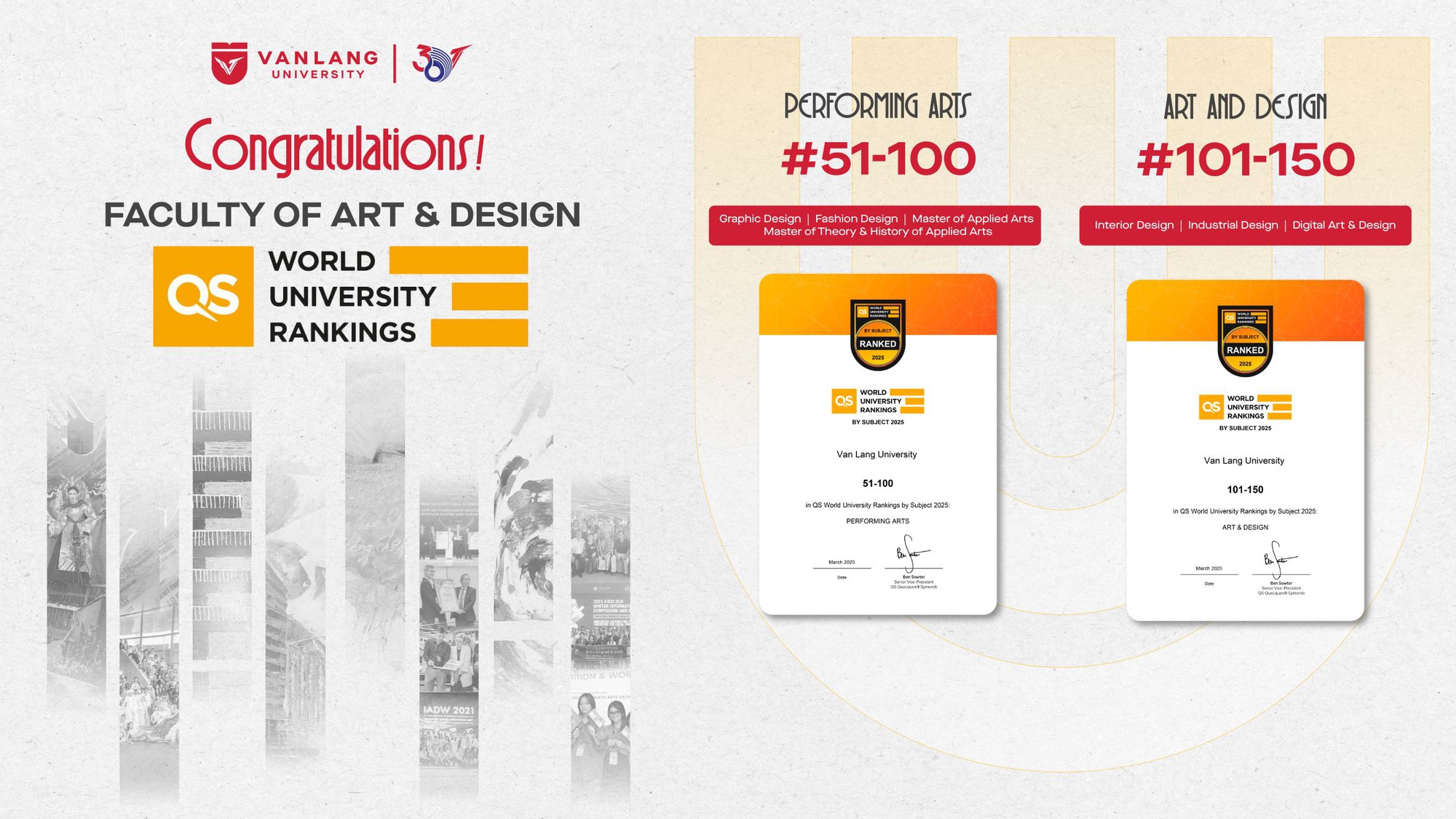 Ngày 12/3, Trường Đại học Văn Lang (VLU) trở thành cơ sở giáo dục đầu tiên của Việt Nam lọt vào bảng xếp hạng QS World University Rankings by subject 2025 trong hai lĩnh vực thiết kế (Art & Design) và nghệ thuật trình diễn (Performing Arts). Trong đó, ở top 51-100 toàn cầu về nghệ thuật trình diễn và top 101-150 về thiết kế.